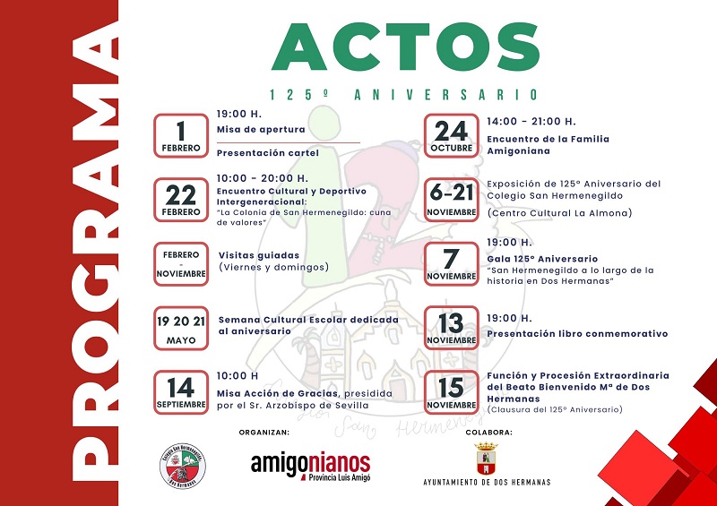 El mes de noviembre estará cargado de actos. Del 6 al 21, el Centro Cultural La Almona albergará una exposición sobre este 125 aniversario, y el día 7 se celebrará también un Encuentro de la Familia Amigoniana en el centro. Ya para el día 13 se presentará el libro conmemorativo que se está preparando, con la participación de varios autores, y que recogerá aspectos históricos y académicos del centro. El día 15 tendrá lugar la clausura de este 125 aniversario con una función y procesión extraordinaria del beato Bienvenido de Dos Hermanas, primer alumno del centro y el primer nazareno beatificado.