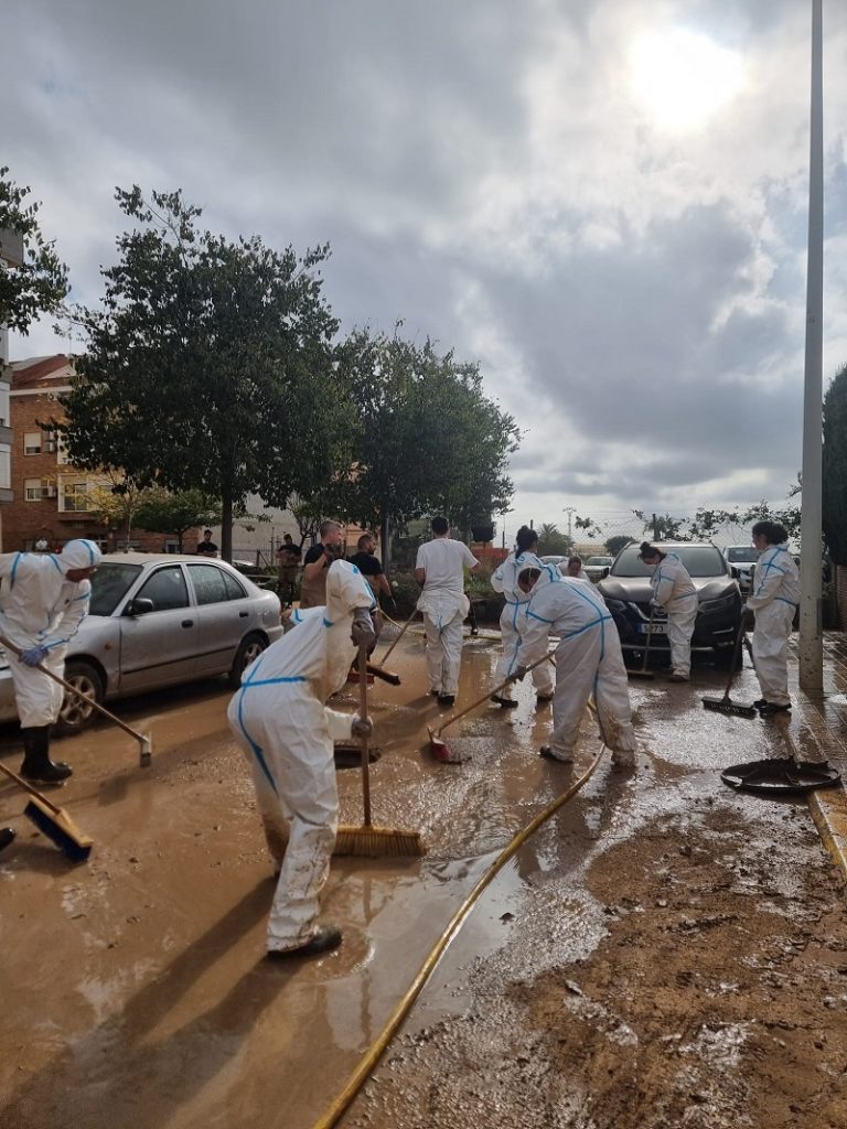 El sábado 23 por la mañana, el grupo de voluntario nos dividimos. Dos de nosotros fuimos al colegio de Jovi para descargar otra furgoneta más proveniente de Santa Rita con las últimas sillas que no entraron en el camión. Mientras tanto, el resto del grupo se dirigió a Paiporta. Coches completamente destrozados amontonados unos sobre otros, árboles, señales, objetos arrastrados por cada rincón de cada calle, todo sucio, polvoriento, embarrado… bajos y locales destrozados, tanques, uniformes de soldados, colas esperando a recibir algo de comer o ropa que ponerse…gente que lo ha perdido todo… tristeza, silencio, miradas perdidas y cabezas abatidas… Nos encontramos un escenario totalmente desolador más propio de una guerra que de los alegres pueblos valencianos. Impactante, conmovedor… Nos inundó una sensación de pena y dolor por todo aquello que llegaba a nuestro alcance. Nunca imaginamos encontrarnos algo así y menos después de tres semanas del suceso.